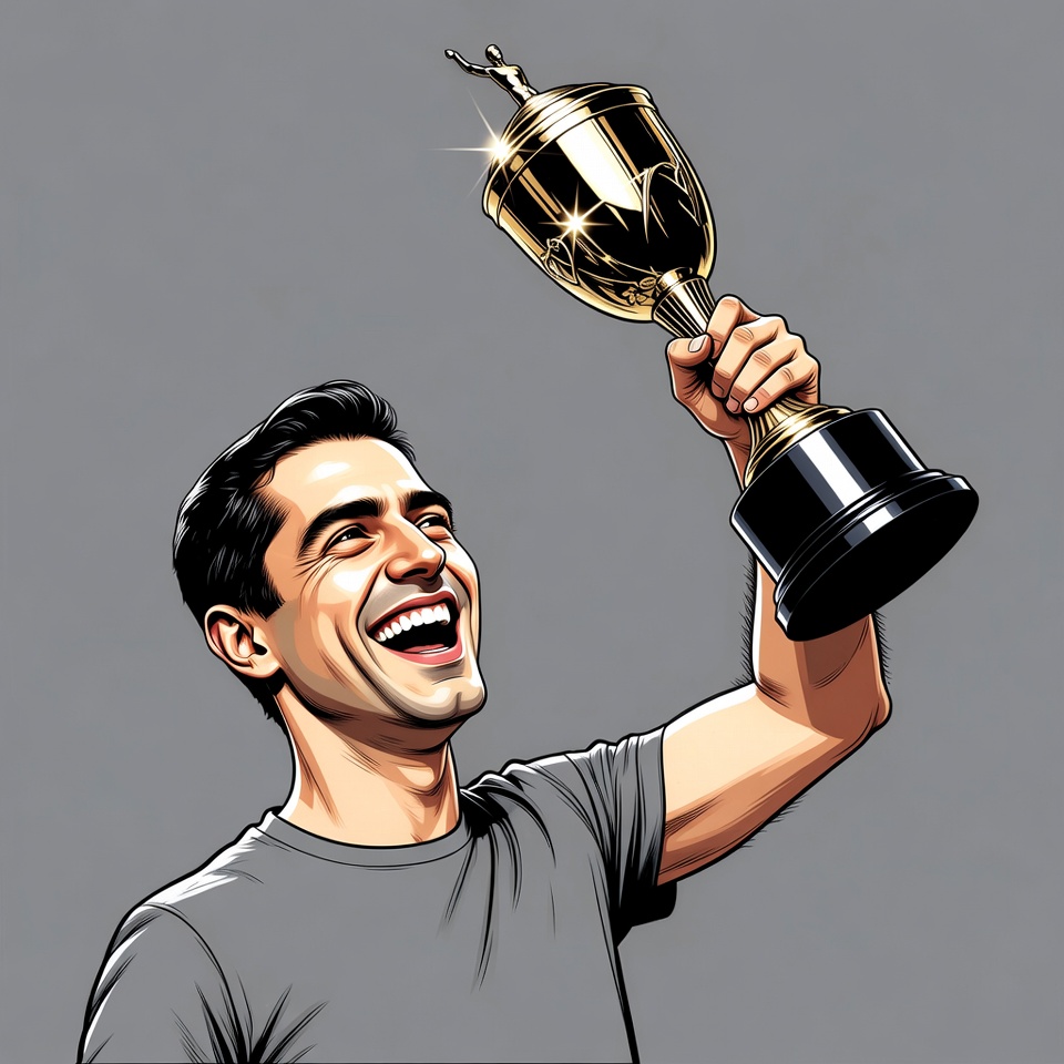A young man with short dark hair smiles broadly while raising a large golden trophy with both hands. He wears a gray t-shirt and stands against a plain gray background. The image is a vibrant illustration with glowing highlights on the trophy.