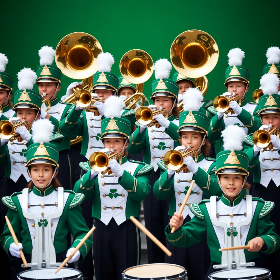 A group of young Asian girls in green and white marching band uniforms with gold plumes play brass instruments and drums. They stand in formation against a solid green background, holding trumpets, tubas, and drumsticks. The uniforms feature gold shamrocks and white accents.