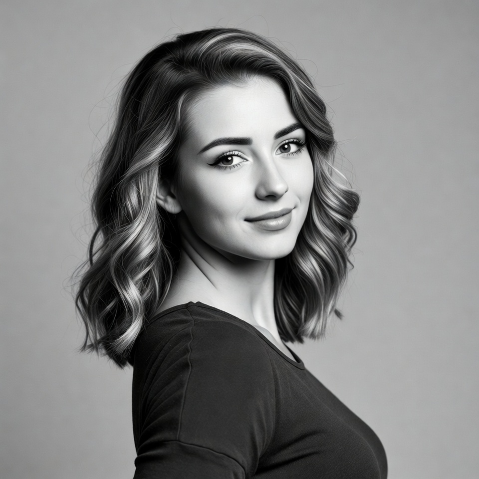 A young woman with shoulder-length wavy hair turns her head slightly to the side with a gentle smile. She wears a dark sleeveless top and is positioned against a plain gray background. The black and white portrait highlights her facial features and soft expression.