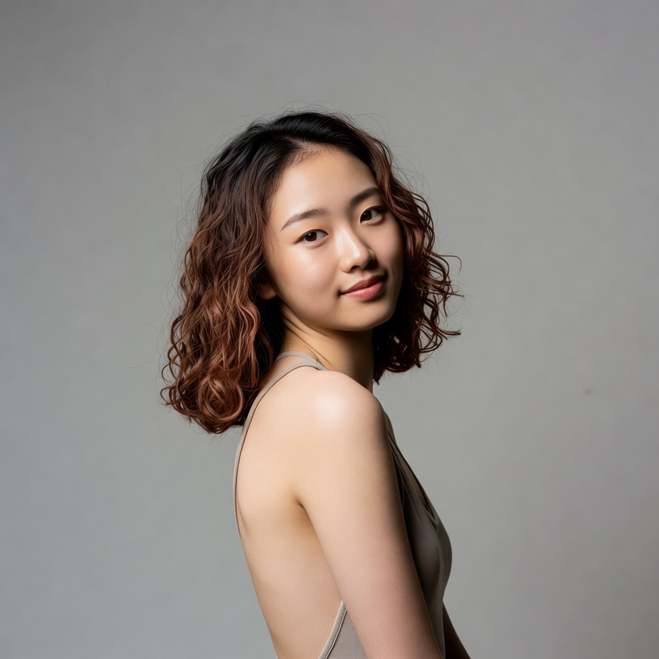 A young Asian woman with shoulder-length wavy brown hair turns her head slightly to the side against a plain gray background. She wears a sleeveless gray top that reveals her shoulders and arms. Her expression is gentle with a subtle smile and focused eyes.