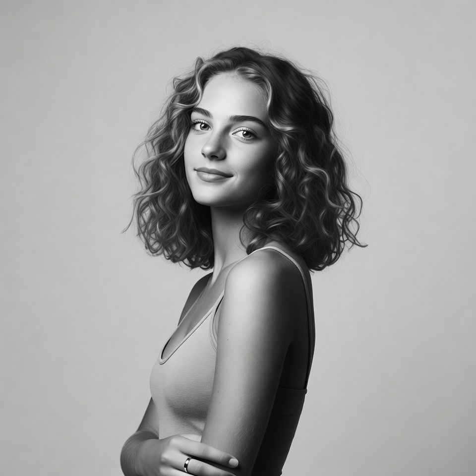 A young woman with long curly hair smiles gently at the camera in a black and white portrait. She wears a sleeveless top and stands with arms crossed against a plain gray background. Her expression is warm and confident.