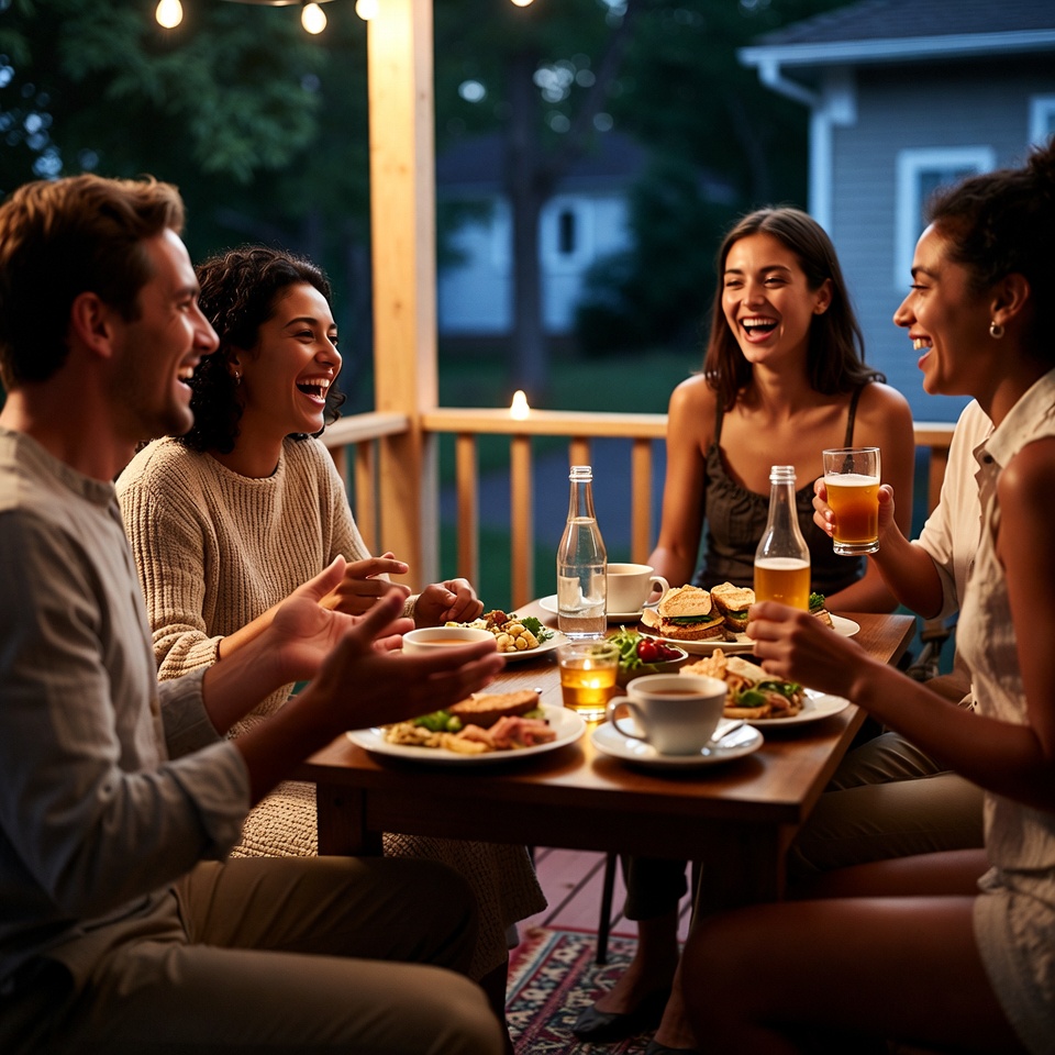 A diverse group of four adults, including two men and two women, sits around a wooden table on a porch laughing together. They are enjoying a meal with plates of food, beers, and tea under string lights at dusk. The setting features a wooden deck with greenery and a house in the background.