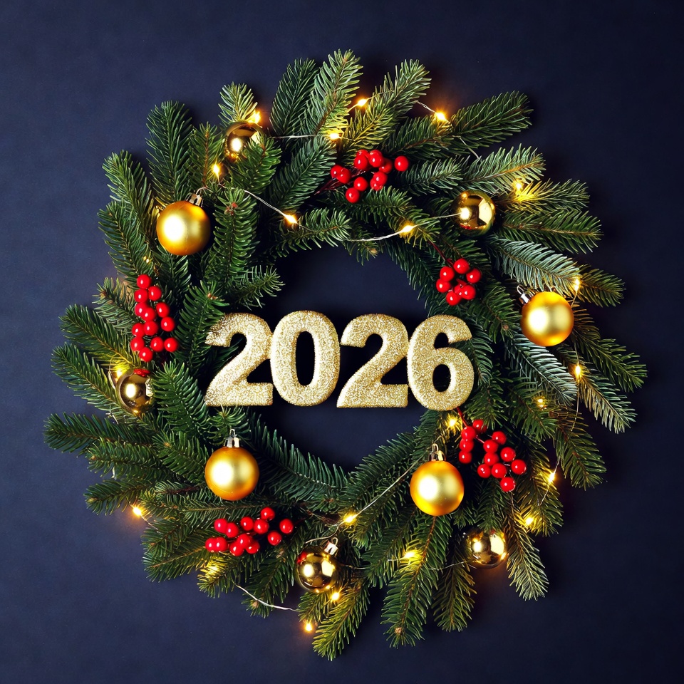 2026, Christmas decor, New Year, New Years wreath, dark background, evergreen wreath, festive decoration, fir branches, gold baubles, gold numbers, gold ornaments, golden text, holiday wreath, holly berries, illuminated wreath, red berries, shiny ornaments, string lights, winter holiday, Christmas wreath