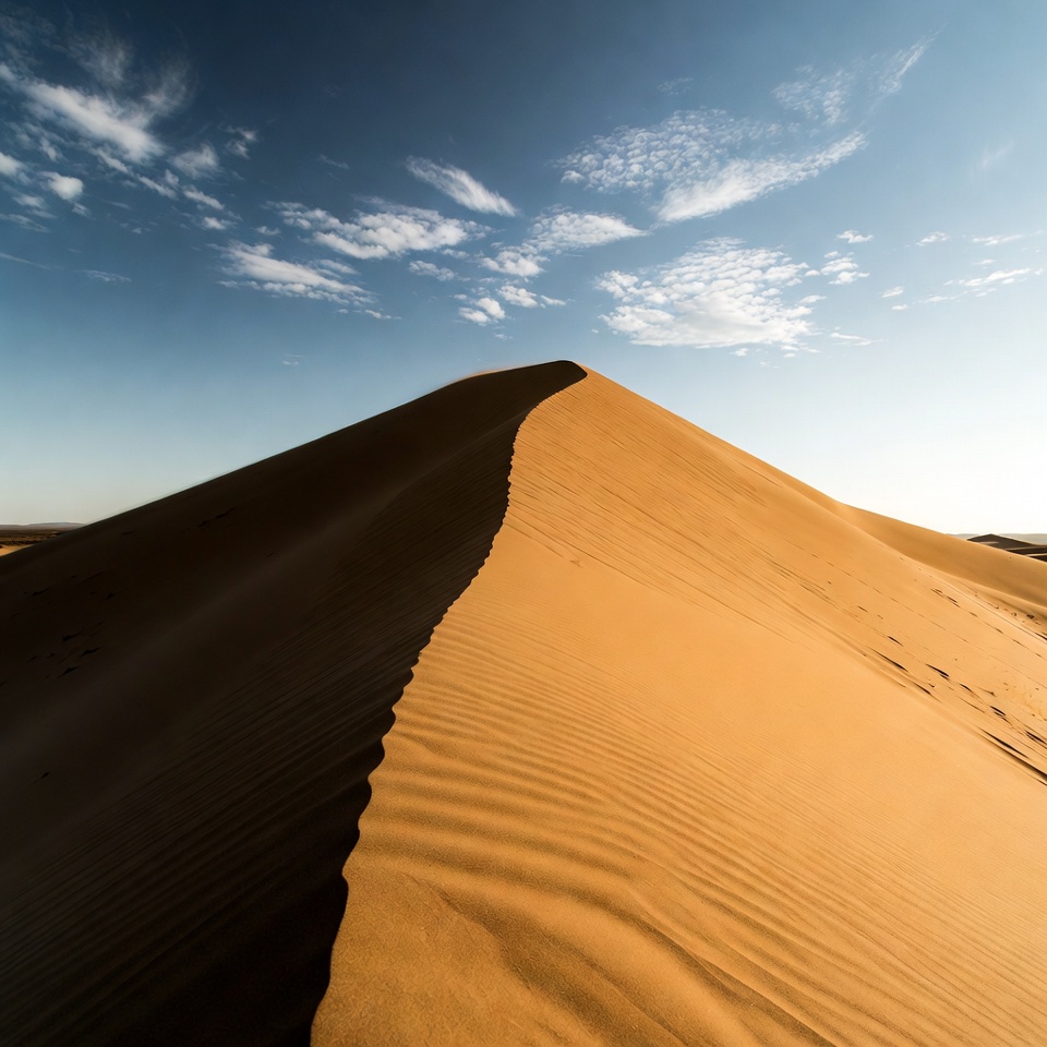 arid landscape, blue sky, desert, desert landscape, dune crest, dune peak, dune shadow, golden sand, horizon, nature, orange sand, outdoors, sand ripples, scenery, sky clouds, sunlight, textured sand, vast desert, white clouds, sand dune