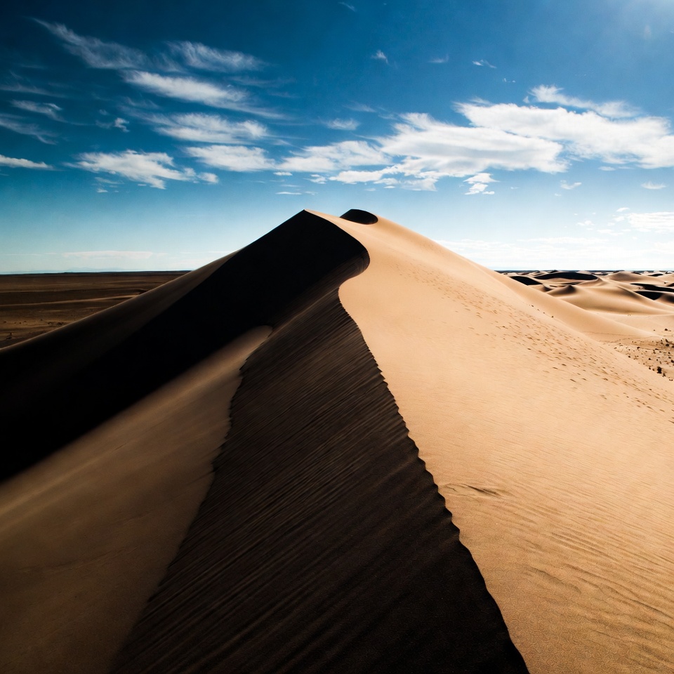 arid landscape, blue sky, clear sky, clouds, desert, desert landscape, dune peak, dune ridge, dunes, golden sand, nature, outdoor, sand, sandy hill, scenery, shadows, sunlight, tall dune, vast desert, sand dune