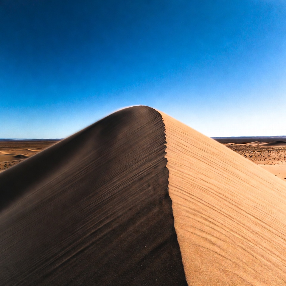 A tall sand dune rises sharply against a clear blue sky in a vast desert landscape. The dune's crest shows a distinct line separating shadowed and sunlit sand. Endless dunes stretch into the horizon under bright sunlight.