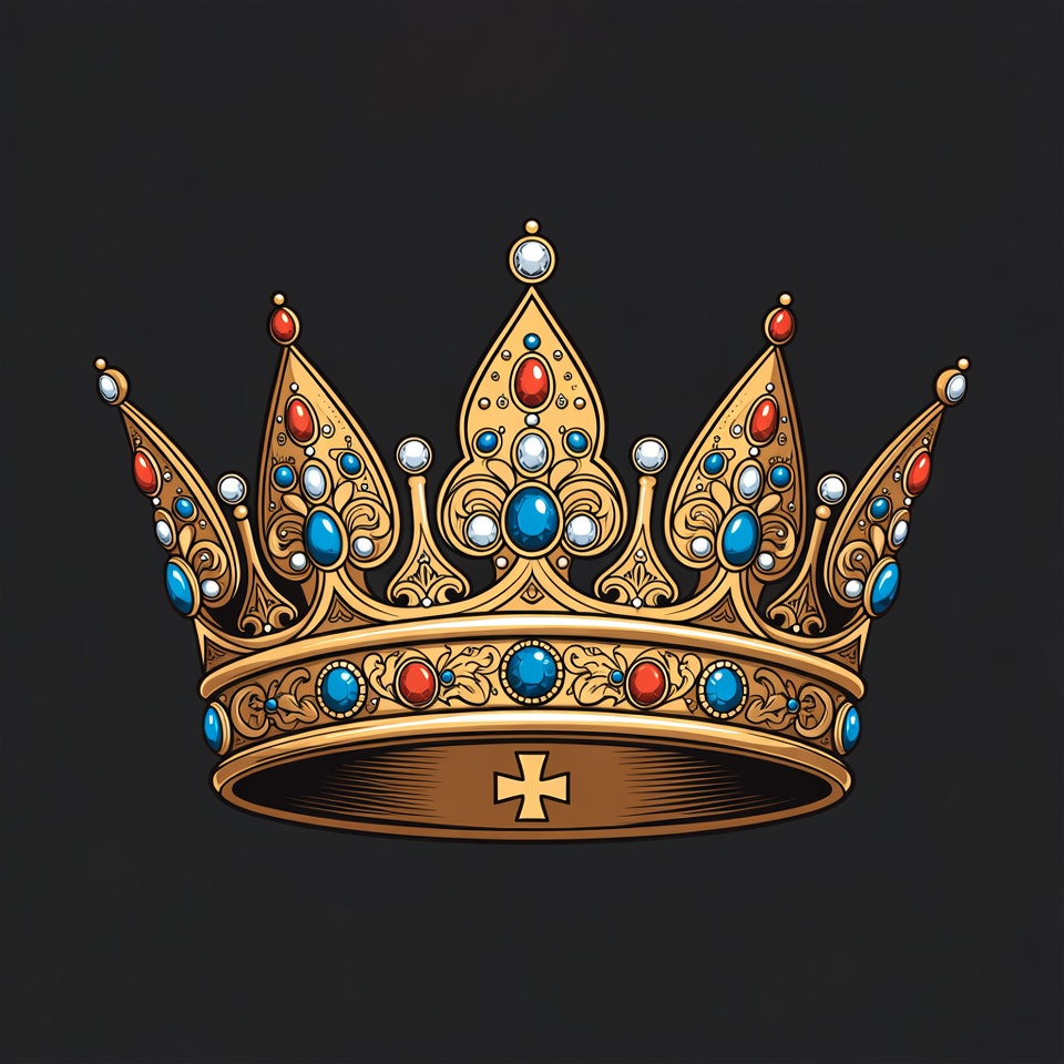 An ornate golden crown features intricate filigree designs and colorful gemstones in red, blue, and clear. It has pointed arches topped with pearls and a cross emblem on the band. The illustration is isolated against a dark background.