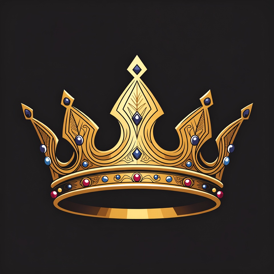 A detailed golden crown with ornate peaks and jewel accents sits centered on a solid black background. The crown features intricate gold filigree, purple and blue gemstones, and a polished metallic shine. It is illustrated in a vector style with sharp edges and vibrant colors.