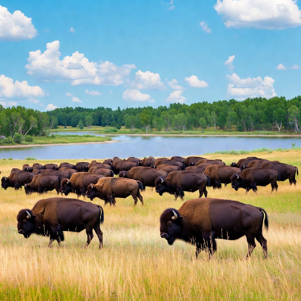 American bison, animals, blue sky, buffalo, clouds, field, forest, golden grass, grass, grazing, green trees, herd, lake, nature, outdoors, prairie, sky, sunny day, trees, water, wildlife, bison