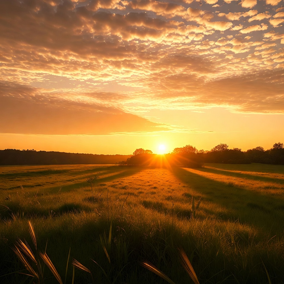 A vibrant sunrise illuminates a vast field of golden wheat with rays of sunlight piercing through scattered clouds. Tall grass blades sway in the foreground, casting long shadows across the field. Dark silhouettes of trees line the horizon under the orange and yellow sky.