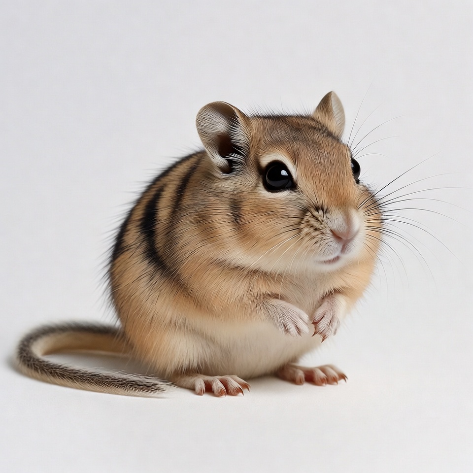 A small chipmunk with light brown fur and dark stripes sits on a plain white background. It has large black eyes, prominent whiskers, and tiny paws held close to its chest. The chipmunk faces forward with a curious expression.