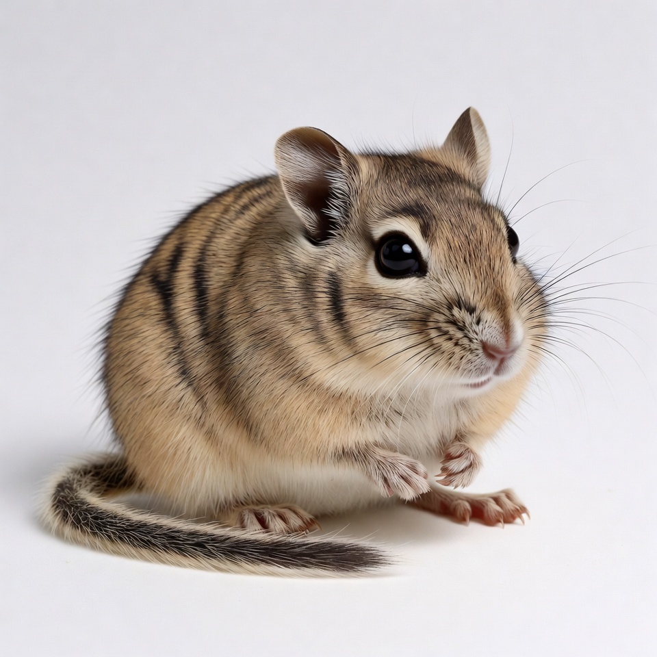 A small gerbil with light brown fur and dark stripes sits upright on a plain white background. It has large black eyes, prominent whiskers, and tiny paws held close to its chest. Its long tail curves behind it.