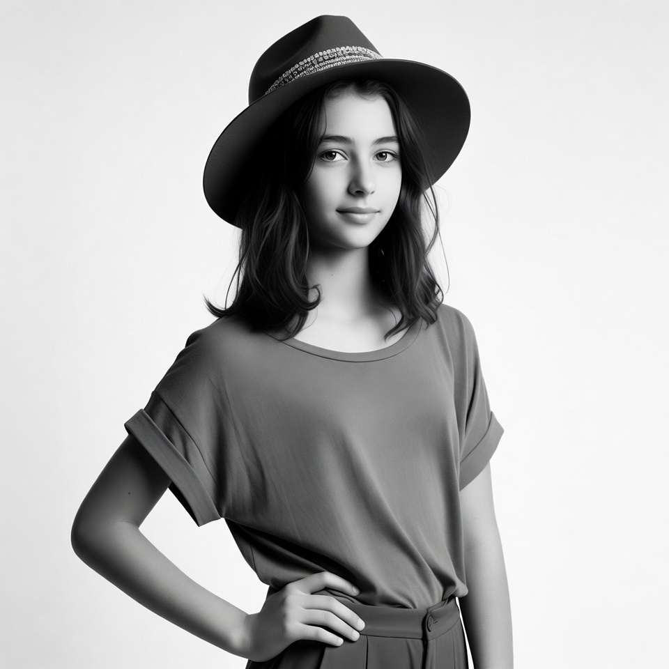 beaded hat, black and white, fashion, felt hat, female, gray top, hand on hip, isolated background, monochrome, portrait, short sleeves, smiling, stylish, teenager, wavy hair, wide-brim hat, young girl, girl