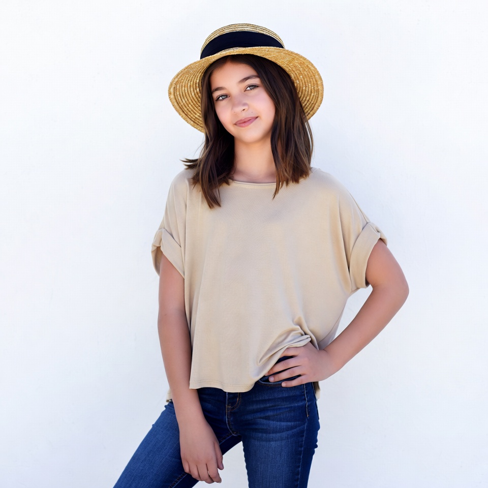 A young girl with shoulder-length brown hair and smiling expression stands confidently against a white background. She wears a beige straw hat with a black band, a loose-fitting beige short-sleeved top, and blue jeans. Her hands are placed on her hips in a casual pose.