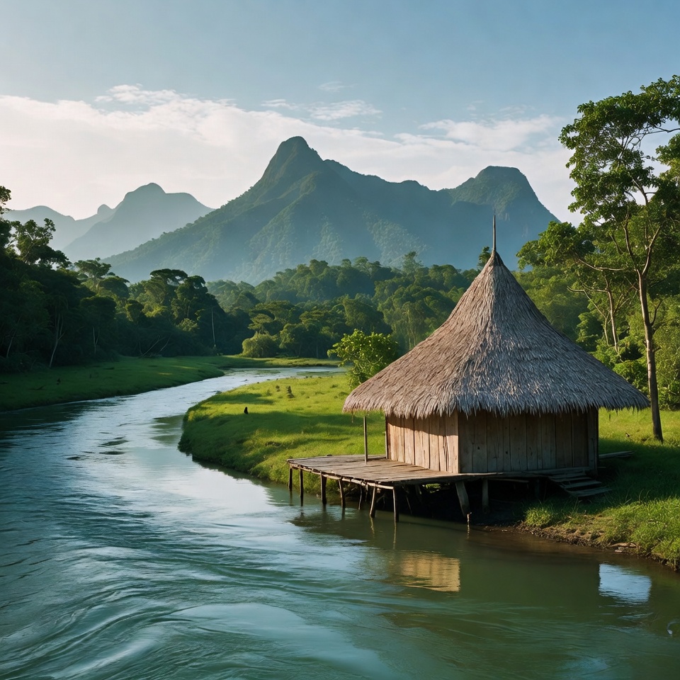 A traditional thatched hut with a conical roof stands on stilts beside a winding green river. Lush green forests and grassy fields surround it, with jagged mountains rising in the background under a partly cloudy sky. The calm water reflects the hut and nearby trees.