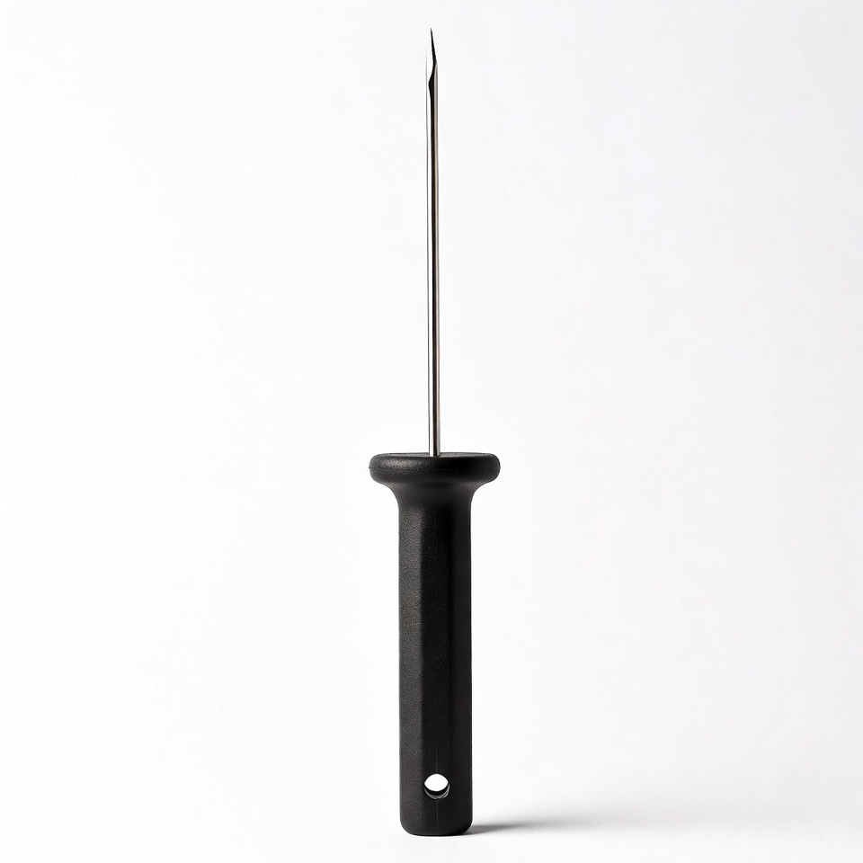 A straight metal skewer with a sharp pointed tip is mounted on a black plastic handle. The handle has a rounded ergonomic shape and a small hole at the bottom. The object is isolated against a plain white background.