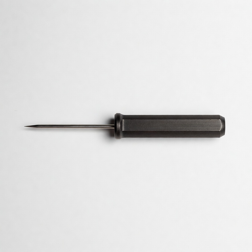 black awl, crafting tool, hand tool, hexagonal handle, isolated, leather tool, metal handle, pointed tip, punching tool, sewing tool, sharp awl, tool, top view, white background, awl