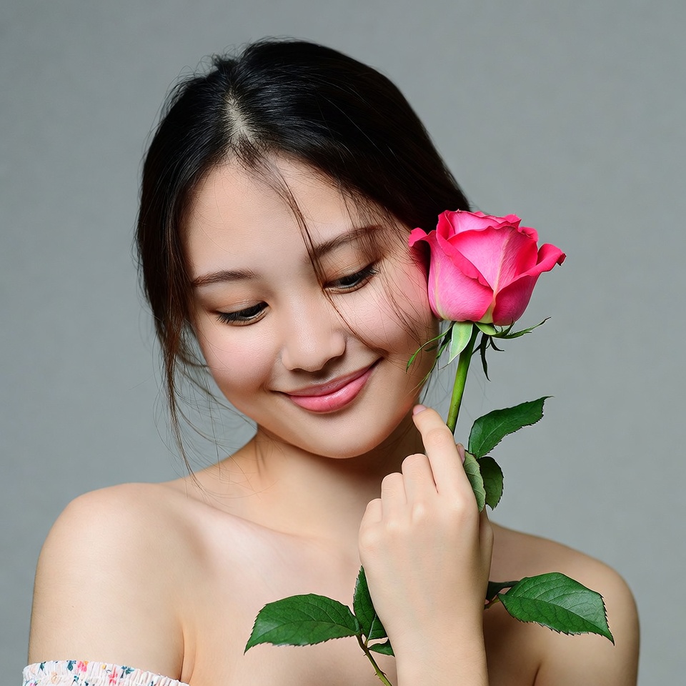 Asian, beauty, black hair, close-up, female, floral top, gray background, green leaves, holding flower, off-shoulder top, pink rose, portrait, rose flower, serene expression, smiling, young woman, woman