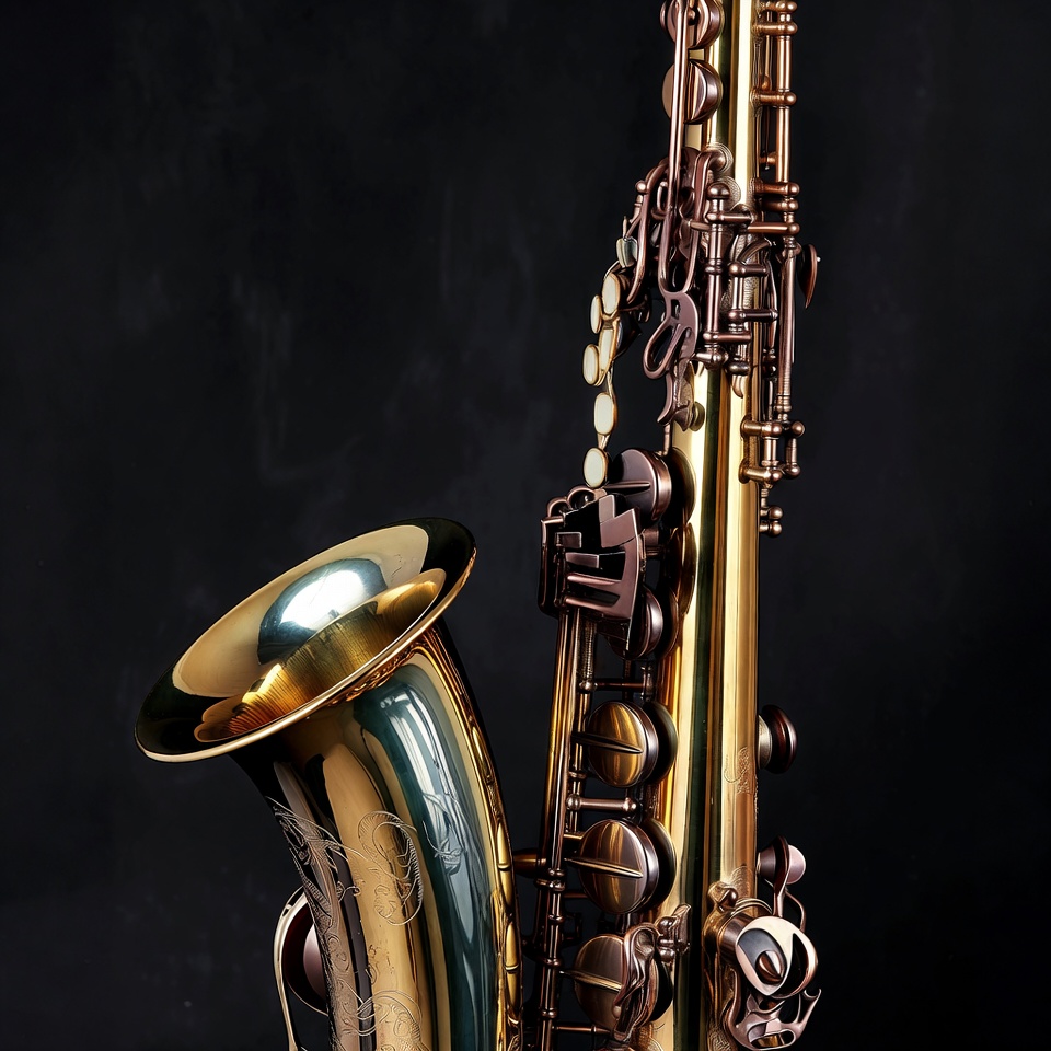 A polished gold saxophone with brass tones stands upright against a dark black background. The instrument features intricate keys, a curved bell with subtle green highlights, and detailed engravings on the body. It is isolated with soft lighting accentuating its metallic shine.