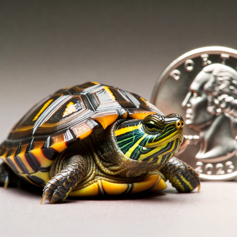 A small baby turtle with vibrant orange, black, and green striped shell faces forward on a neutral background. Next to it sits a large silver dollar coin featuring George Washington's profile. The turtle's detailed head and legs are prominently visible.