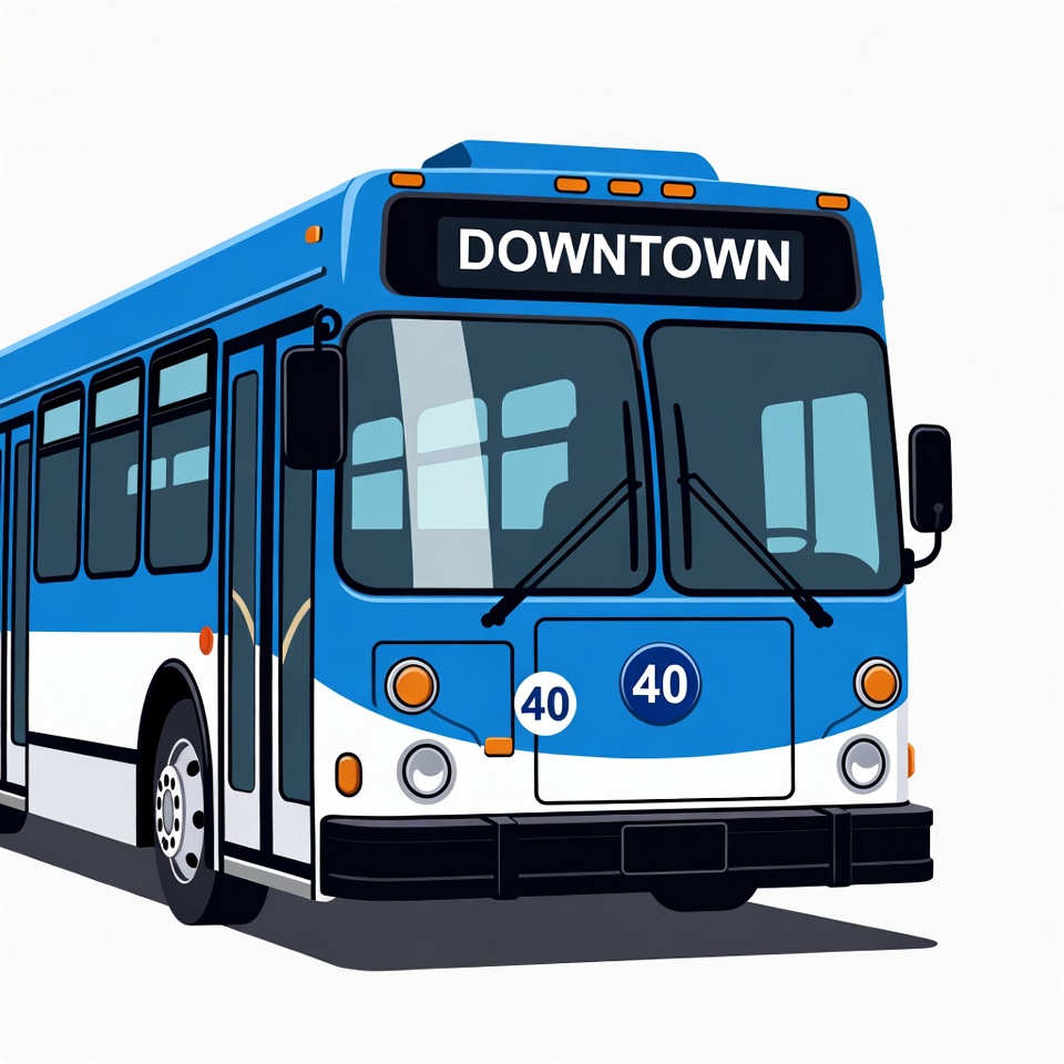 A vibrant blue city bus with white accents displays 'DOWNTOWN' on its electronic sign and route number 40 on the front. The illustration features detailed windows, headlights, mirrors, and yellow turn signals. It is depicted on a white background with a subtle drop shadow.