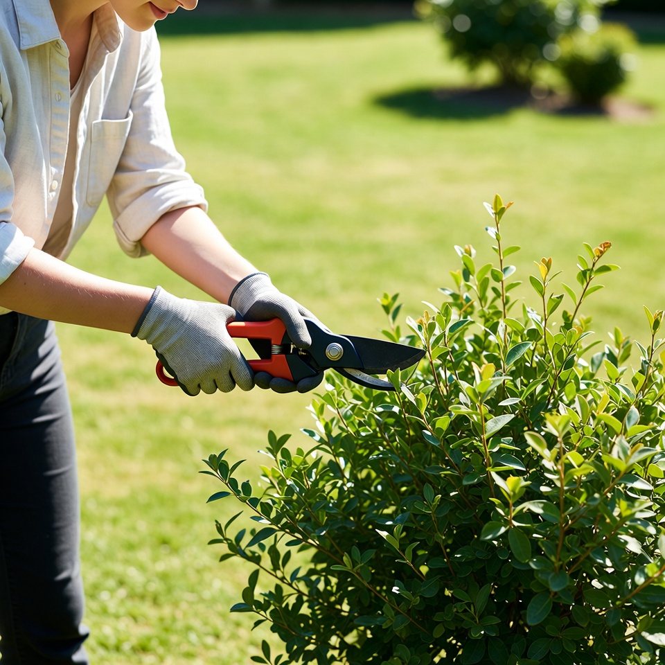 A woman wearing a light shirt, gray pants, and gray gloves uses red-handled pruning shears to trim green bushes in a lush garden. She bends forward attentively while working on the dense shrubbery. The background features green grass and additional bushes.