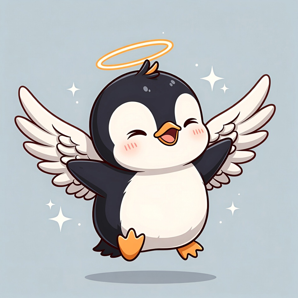 adorable, angel, bird, black white, blushing, cartoon, chibi, cute, feathers, flying, halo, happy, illustration, isolated background, kawaii, plush, smile, sparkles, stars, wings, penguin