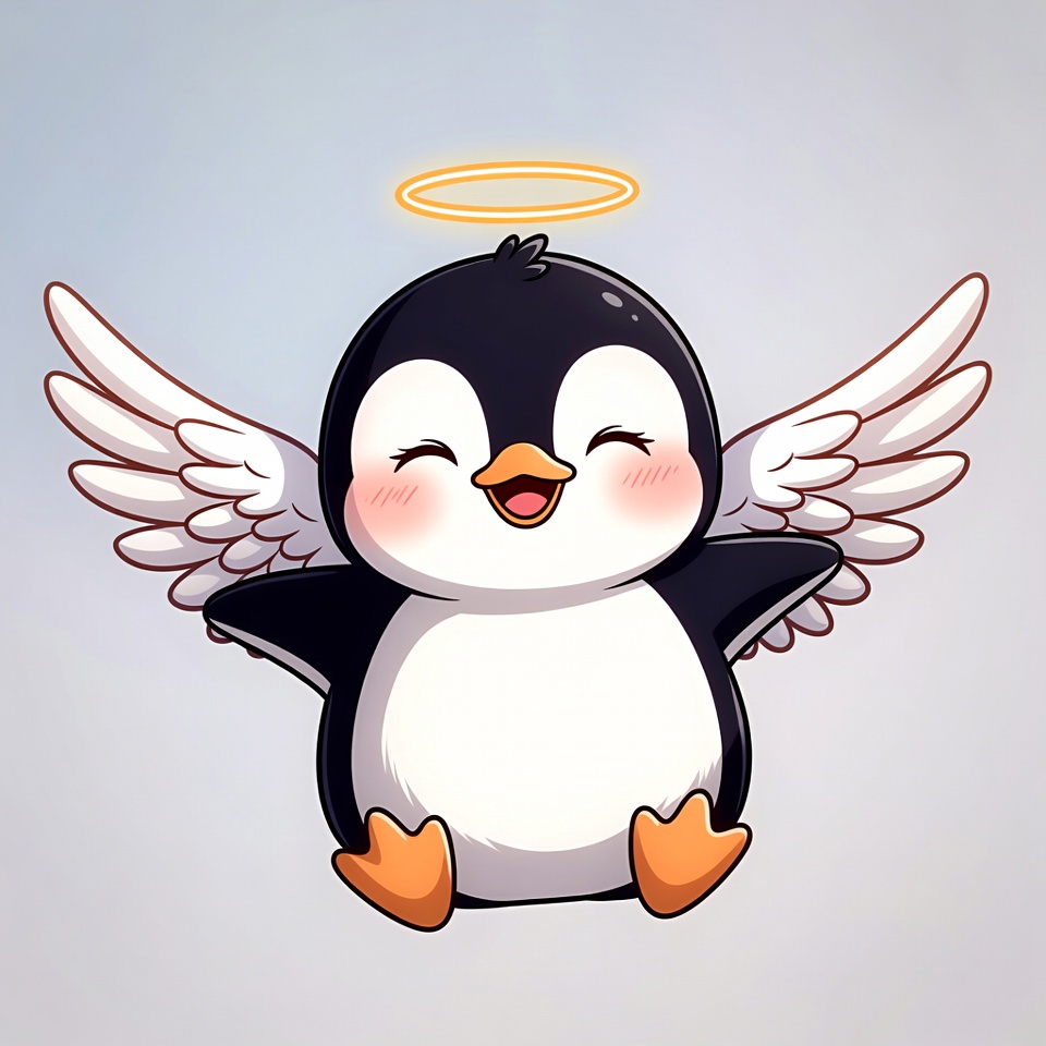 A chibi-style cartoon penguin with black and white feathers spreads its large white wings and has a glowing golden halo above its head. The penguin smiles happily with blushing cheeks and orange feet, posed on a light blue isolated background.