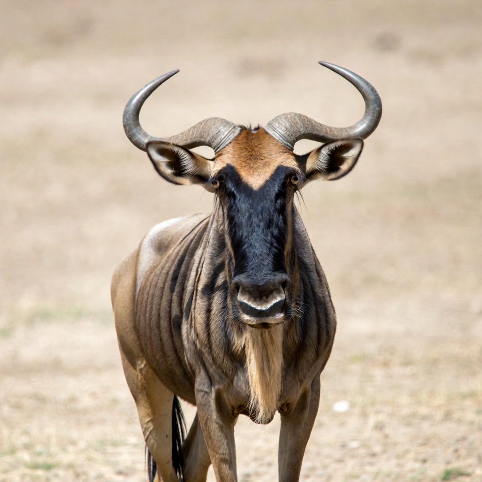 Africa, Serengeti, animal, antelope, black muzzle, brown coat, curved horns, gnu, grass, horns, large horns, mammal, migration, nature, outdoor, plains, portrait, safari, savanna, standing, striped fur, wild animal, wildlife, wildebeest