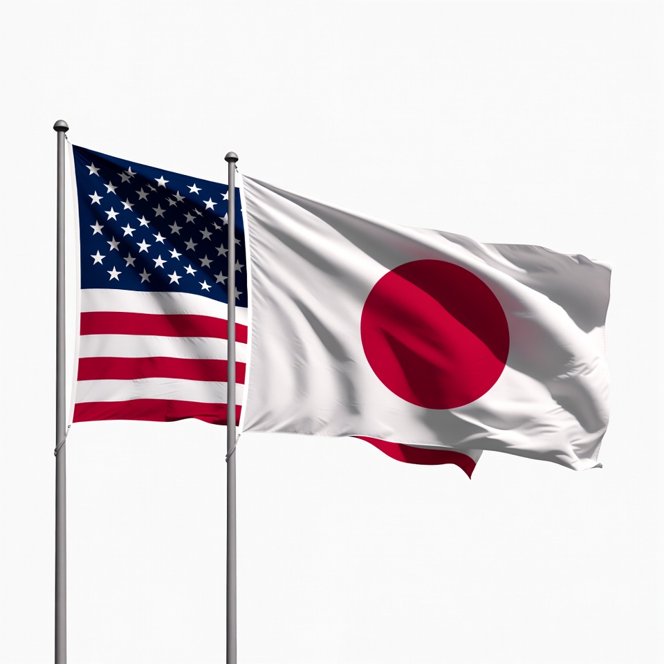 Two flags wave on metal poles against a white background. The American flag features red and white stripes with a blue field of white stars on the left. The Japanese flag displays a red circle on a white field.