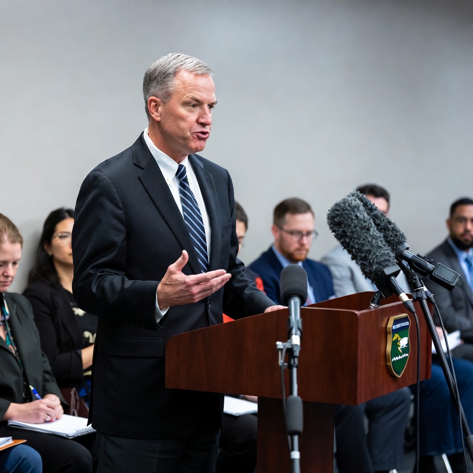 A middle-aged White man in a dark suit and tie stands at a wooden podium with microphones, gesturing with his hand while speaking. He has short graying hair and is positioned in front of a blurred audience seated in rows. Several attendees, including men and women of diverse ethnicities, listen attentively in a conference room setting.