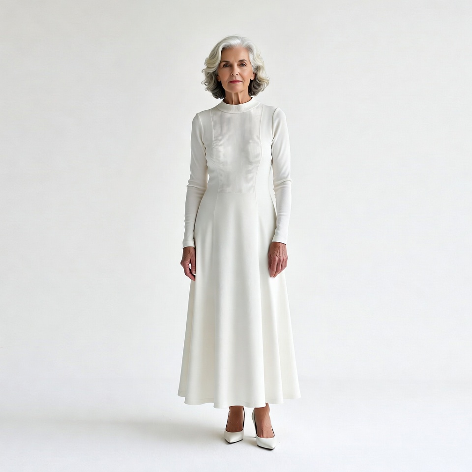 An elderly woman with curly silver hair stands confidently in front of a white background. She wears a long white dress with a high neckline, long sleeves, and a flared skirt, paired with white high-heeled shoes. Her hands are clasped in front of her.