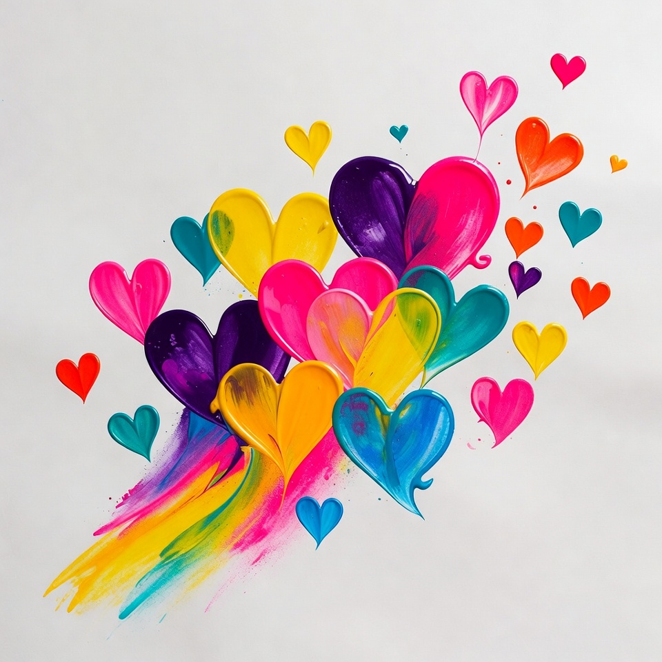A vibrant cluster of multicolored heart shapes in pink, yellow, purple, blue, and orange is splashed across a white background. The hearts feature glossy paint effects with drips and splatters, creating a dynamic and playful arrangement. Some hearts overlap and trail into rainbow-like streaks.