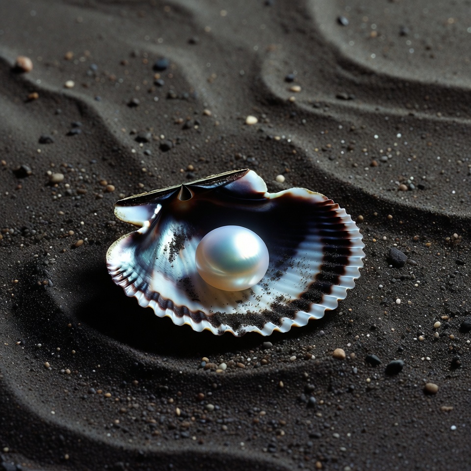A large white pearl sits inside an open seashell on a dark sandy beach. The shell has ridged edges and subtle sand grains clinging to it. Fine black sand dunes form the textured background.