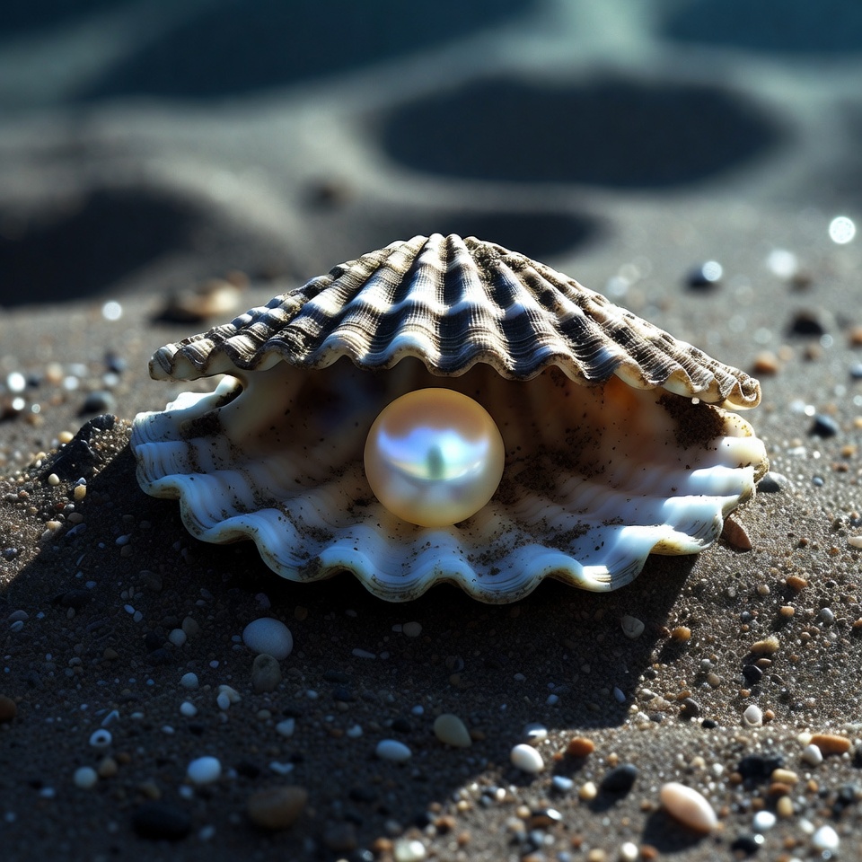An open scallop seashell lies on sandy beach with small pebbles scattered around. A large lustrous pearl sits centered inside the shell. Sunlight casts shadows, highlighting the textured shell edges and iridescent pearl.