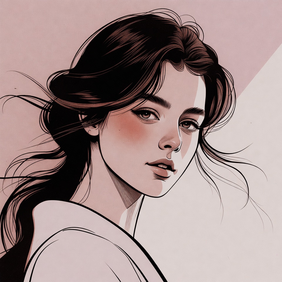 A young woman with long dark hair styled in a loose updo gazes to the side with subtle makeup and flushed cheeks. She wears a white off-shoulder top against a soft pink gradient background. The digital illustration features smooth line art and gentle shading.