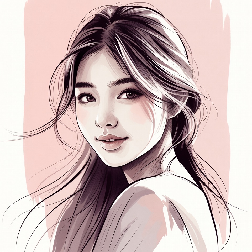 Asian, almond eyes, artistic, beautiful, closeup, dark hair, digital art, drawing, face, female, flowing hair, gradient background, illustration, long hair, pink background, portrait, soft features, stylized portrait, subtle smile, young woman, woman