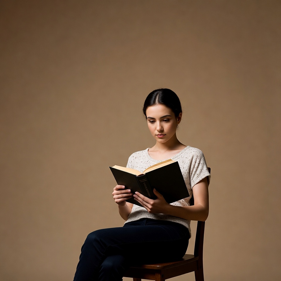 A young woman with dark hair tied in a bun sits on a wooden chair against a beige background. She wears a light-colored off-shoulder top and dark pants while holding an open book with both hands. Her focus is directed downward at the pages of the book.