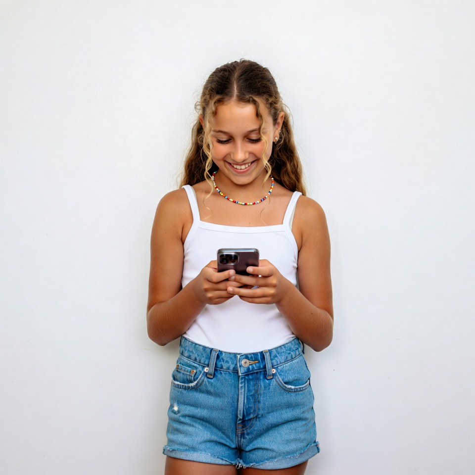 A young girl with curly hair stands against a white background, smiling happily as she looks down at her smartphone. She wears a white tank top, a colorful beaded necklace, and light blue denim shorts. Her hair is tied in pigtails, and she holds the phone with both hands.