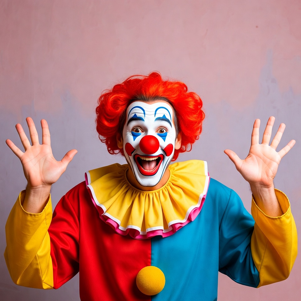 Clown with hands raised excitedly