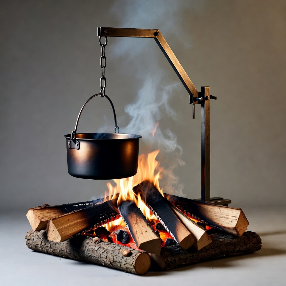 black pot, burning fire, camp cooking, chain, cooking pot, fire, flames, hanging pot, isolated background, metal tripod, outdoor cooking, pot, smoke, wood logs, campfire