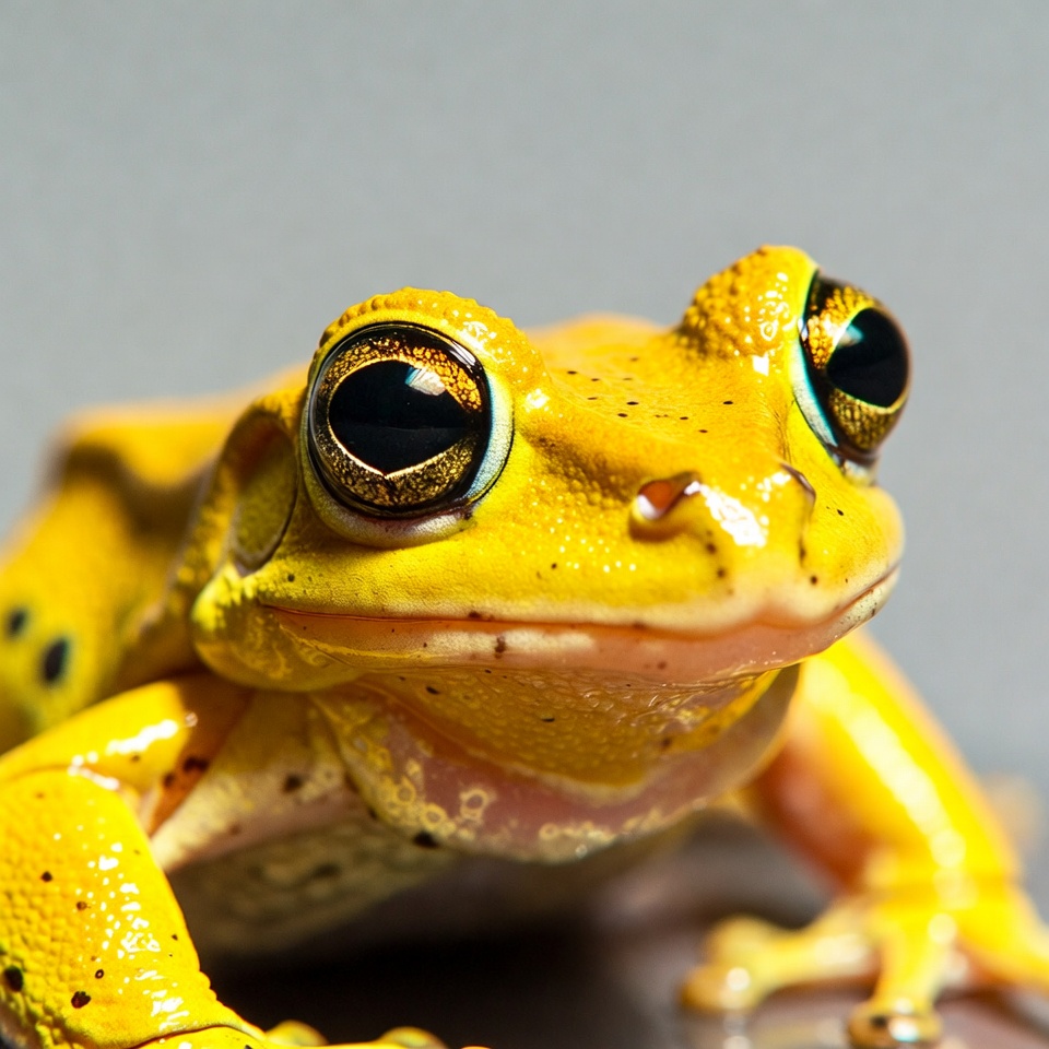 A vibrant yellow tree frog with large black eyes stares directly at the camera. Its textured skin features small dark spots, and it sits on a plain gray background. The frog's mouth is slightly open, revealing a subtle smile.
