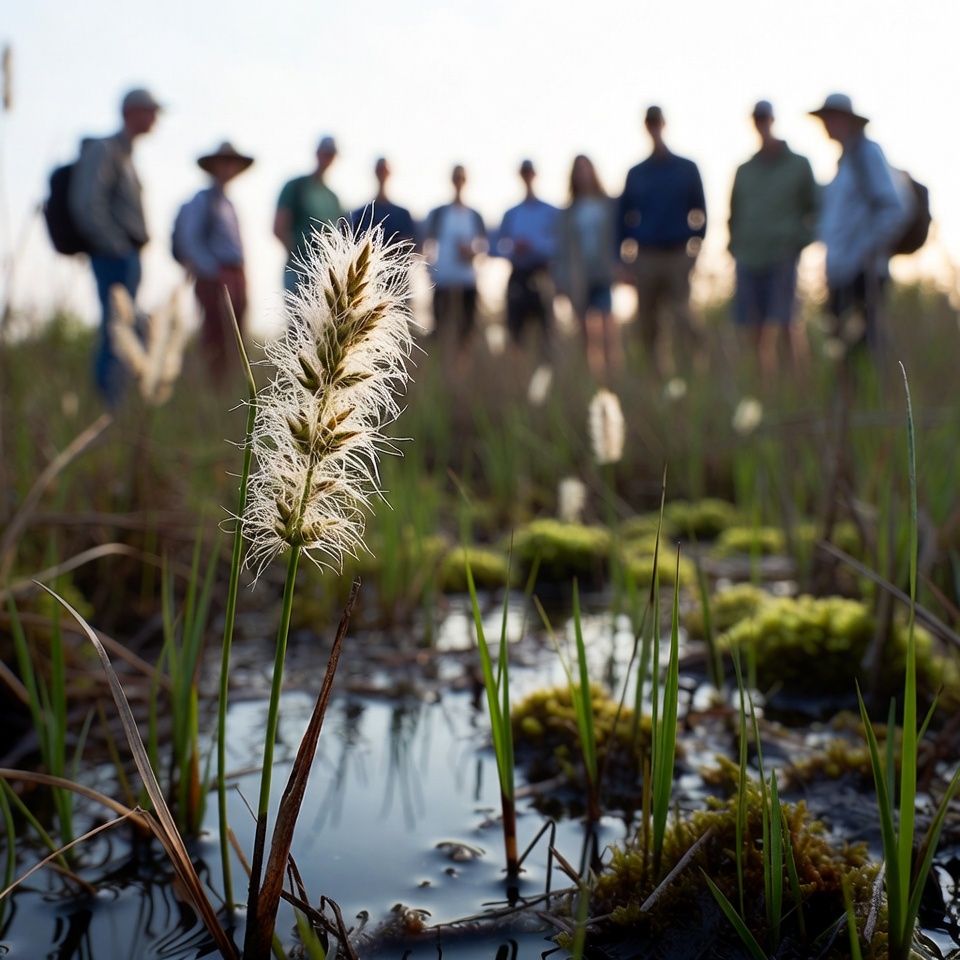 A close-up of a foxtail grass plant in a marshy wetland with shallow water and moss. In the blurred background, a diverse group of hikers wearing hats and backpacks stands observing the surroundings during golden hour light. The foreground grass is sharply focused against the soft bokeh of people and landscape.