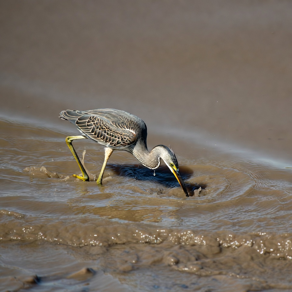 animal, bird, bird watching, feathers, foraging, grey feathers, heron, isolated background, mud, muddy water, nature, ripples, shallow water, wading bird, water bird, wildlife, yellow beak, yellow legs, grey heron