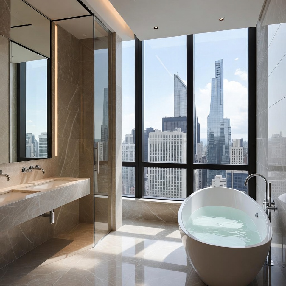 architecture, bathroom design, bathtub, beige marble, city view, contemporary, countertops, freestanding tub, glass walls, high-rise view, hotel bathroom, interior design, luxury home, marble, mirrors, modern interior, penthouse, sinks, skyline, skyscrapers, stone floor, urban landscape, water, white bathtub, windows, luxury bathroom