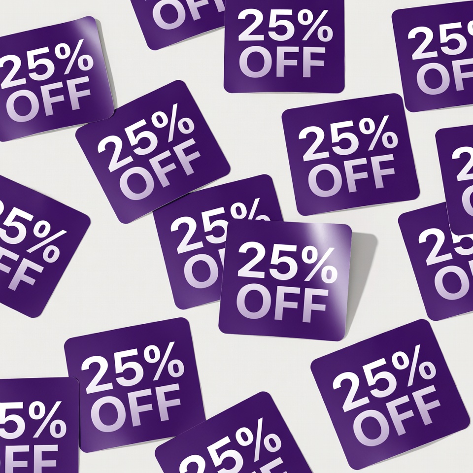 badge, coupon, deal, discount, glossy, label, offer, overlapping, price reduction, promotion, purple stickers, retail, sale, scattered, shiny, shopping, stickers, white background, 25% off