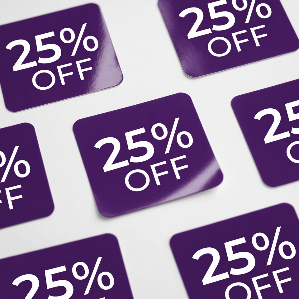 advertising, bargain, clearance, commercial, deal, discount, discount stickers, glossy stickers, off sale, promotion, purple background, purple stickers, retail, sale, sale signs, shopping, square stickers, white background, white text, 25% off