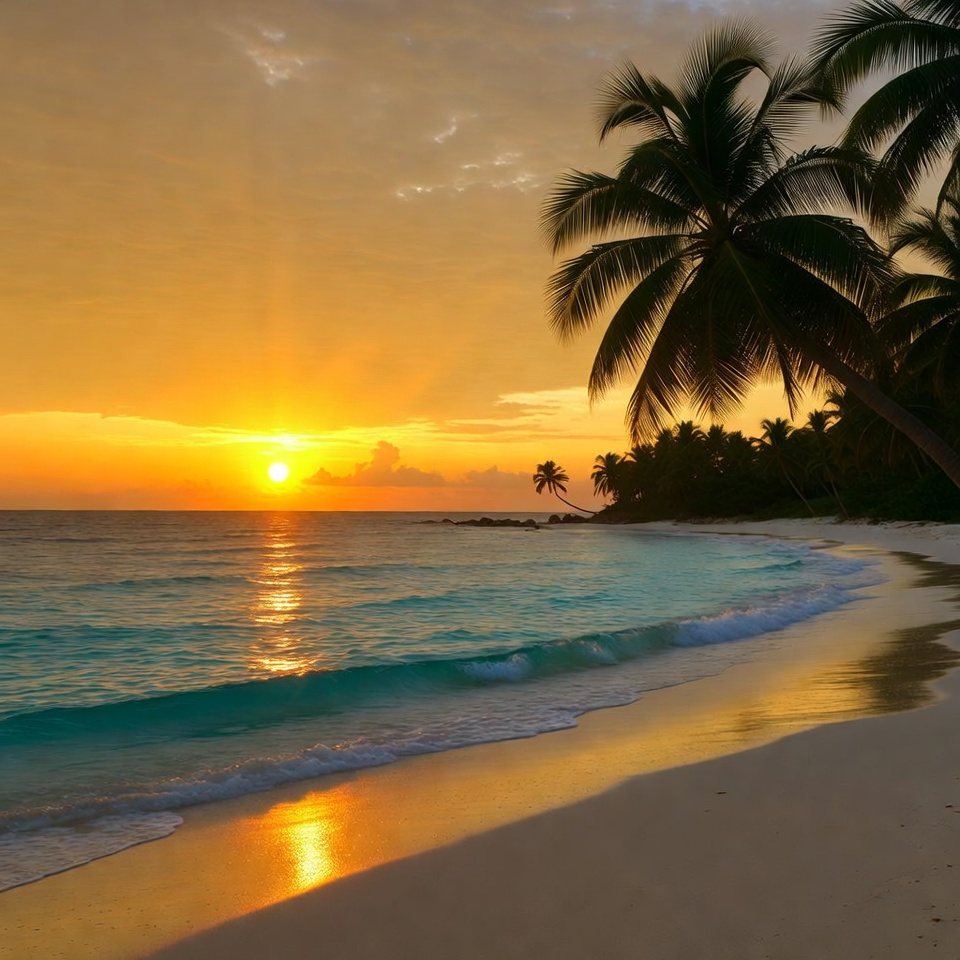 A vibrant sunset illuminates a pristine white sand beach with turquoise waves gently lapping the shore. Tall palm trees sway in the foreground against a colorful orange and yellow sky. The sun's reflection sparkles on the calm ocean water.