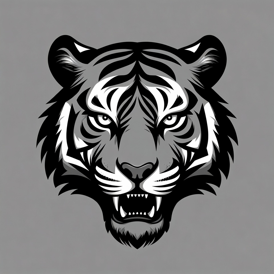 animal, big cat, black and white, clipart, fangs, fierce tiger, illustration, isolated background, mammal, predator, roaring tiger, snarling tiger, stripes, tiger face, tiger head, tiger portrait, vector art, wild animal, wildlife, tiger