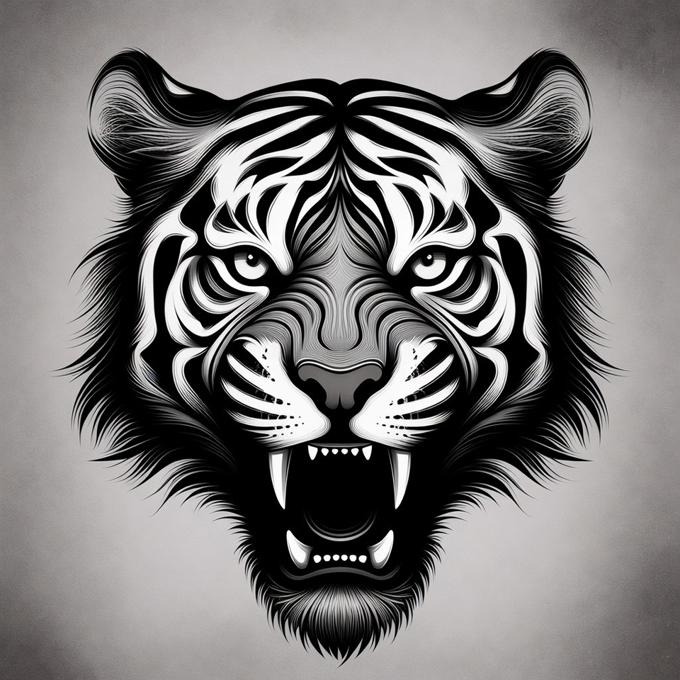 A detailed black and white illustration of a tiger's face with intense eyes and open mouth showing sharp fangs. The tiger's fur features bold stripes and is rendered in a realistic yet artistic style. It is centered on a textured gray background.